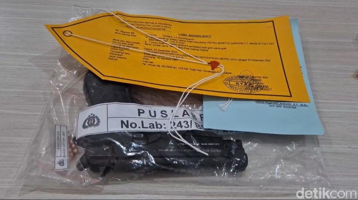 Tony Simanjuntak (45), Ketua GRIB Jaya Harjamukti, menjadi tersangka penganiayaan dan kepemilikan senjata api setelah ditemukan pistol air gun jenis Pietro Baretta Gardone miliknya. Polres Metro Depok menampilkan senjata tersebut saat jumpa pers, dengan peluru gotri berwarna emas terlihat jelas.