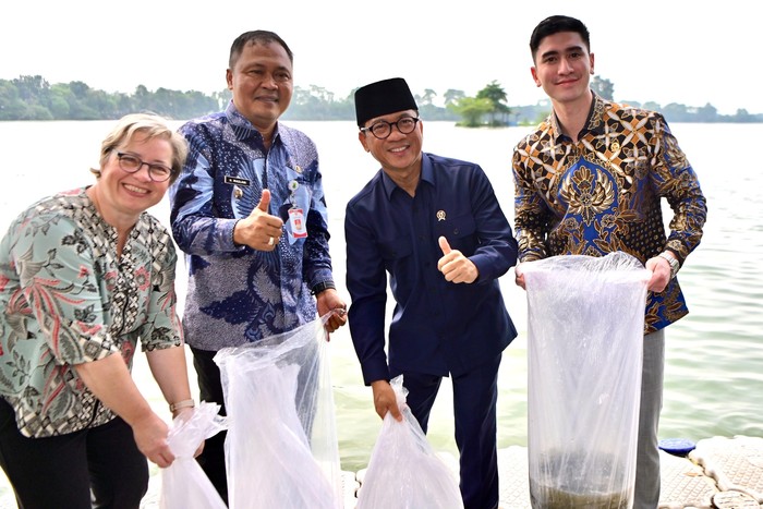 Menteri Desa dan Pembangunan Daerah Tertinggal (Mendes PDT), Yandri Susanto bersama Wakil Mendes PDT, Ahmad Riza Patria menghadiri peluncuran Indeks Risiko Iklim Desa (IRID) di Situ Cipule, Kabupaten Karawang.