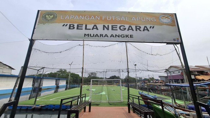 Lapangan futsal apung ‘Bela Negara’ berdiri kokoh di kawasan Muara Angke, Jakarta Utara. Lapangan ini bukan di atas tanah seperti biasanya, tapi di atas drum-drum plastik yang membuatnya mengambang mengikuti pasang surut air laut.